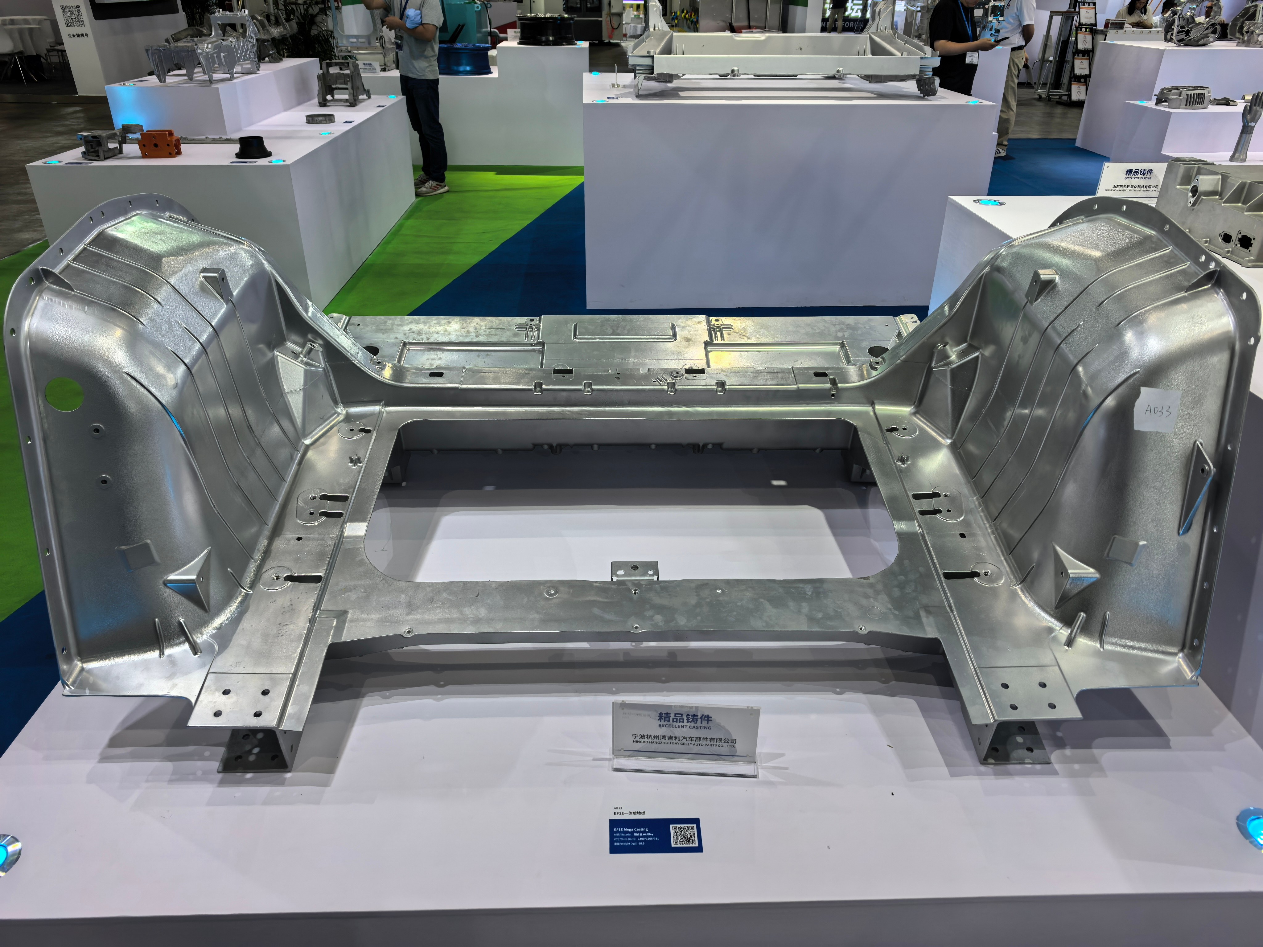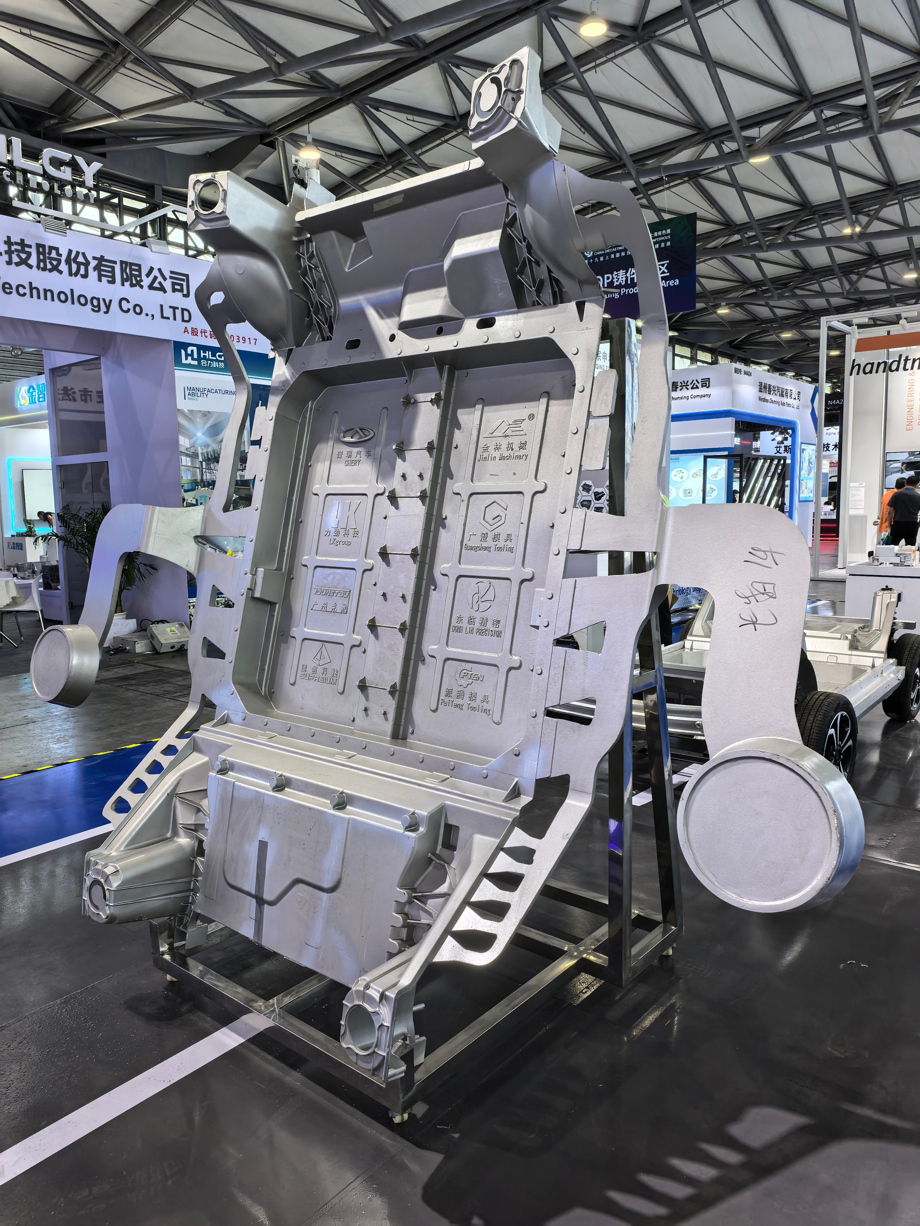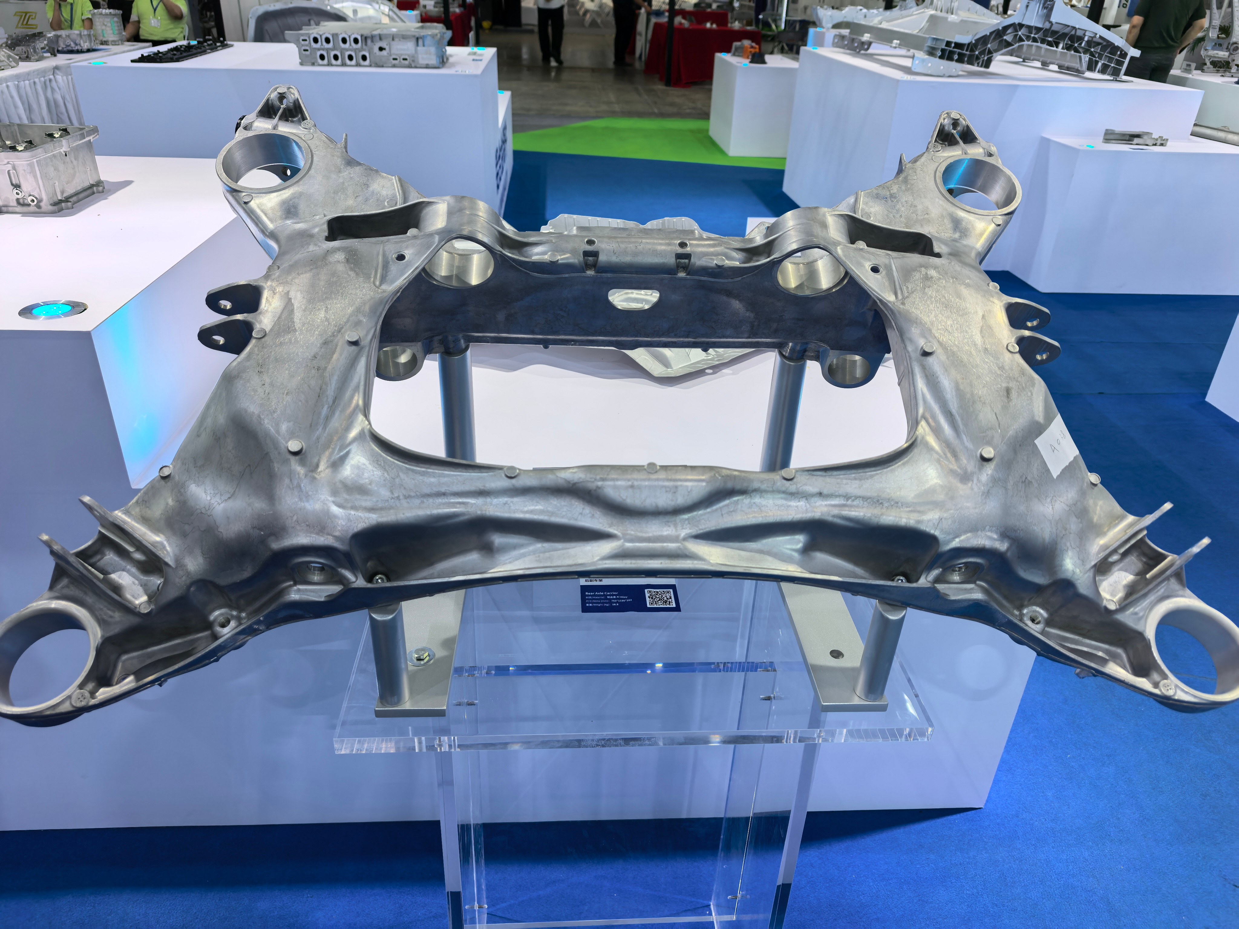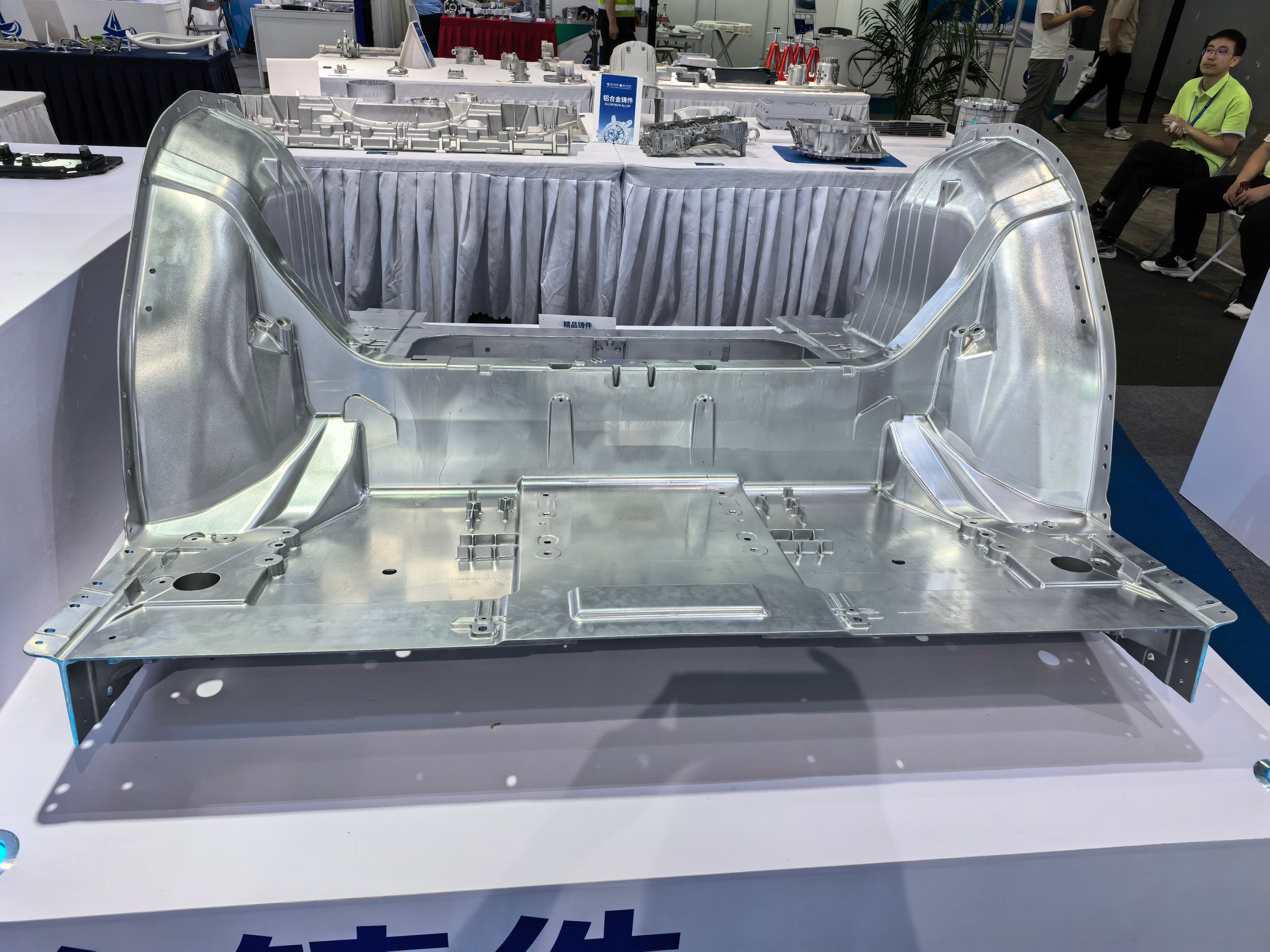 现场展示了包括大型一体压铸件、电池托盘、结构副车架、CNC加工成品等关键部件。