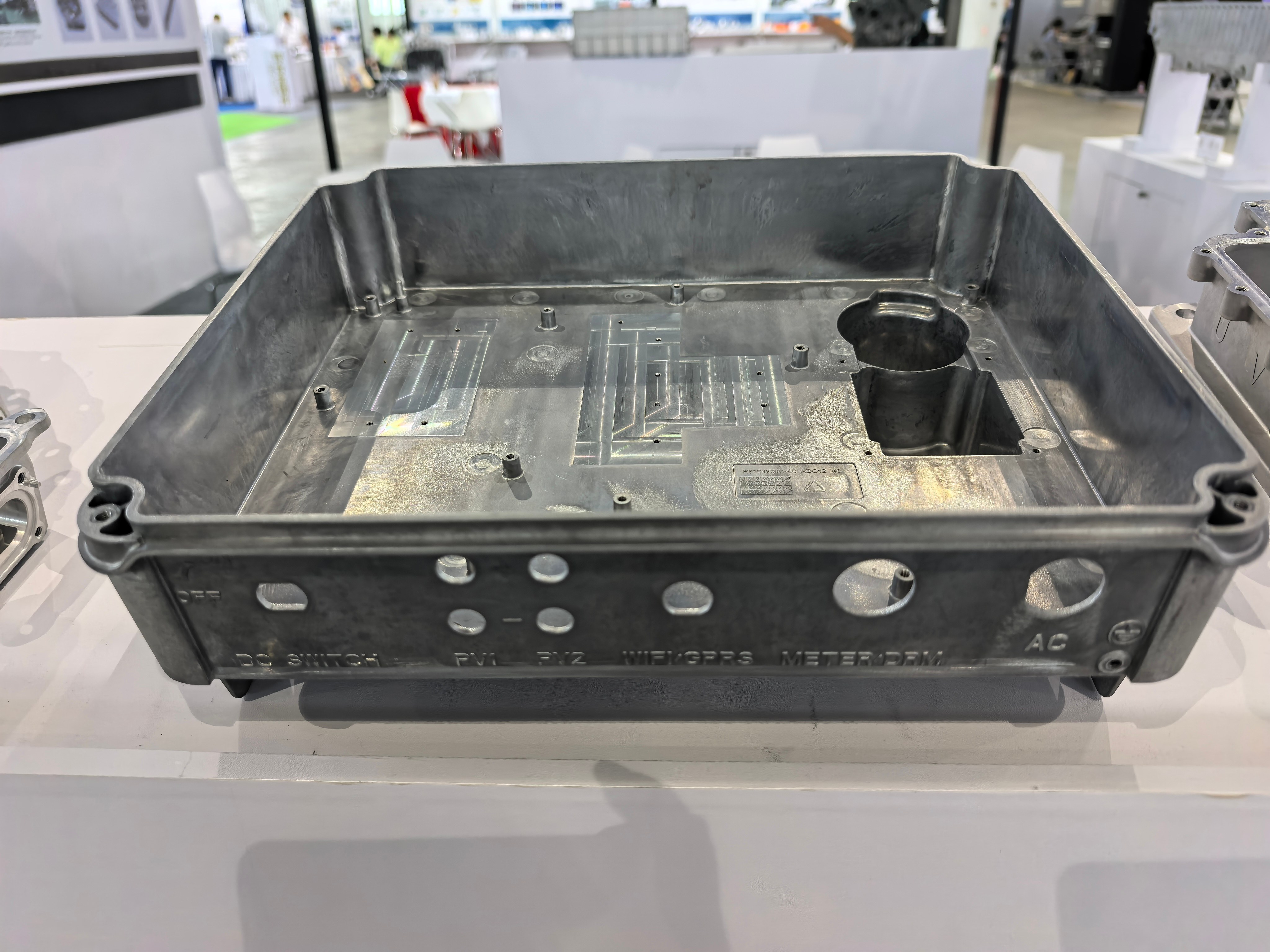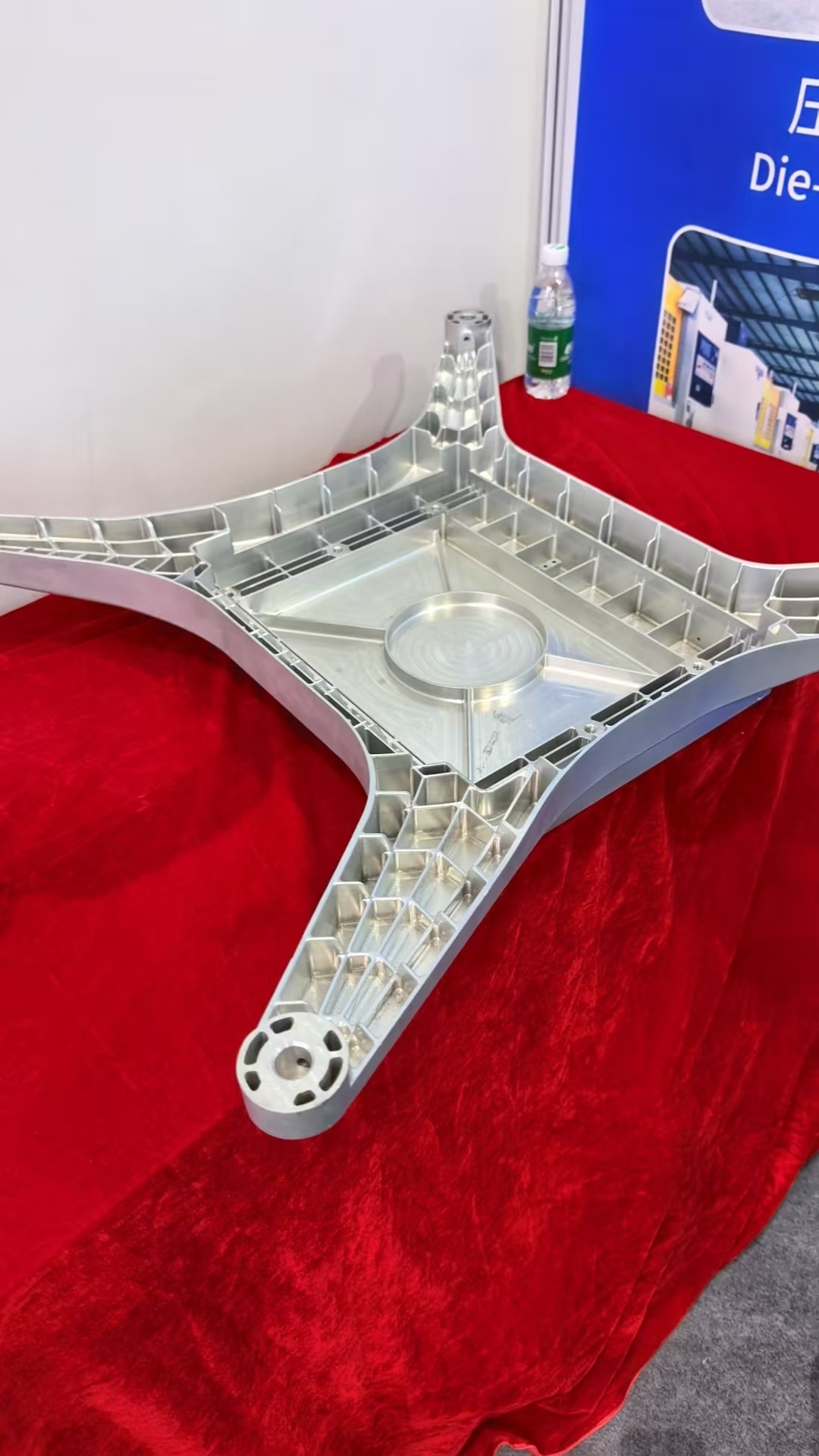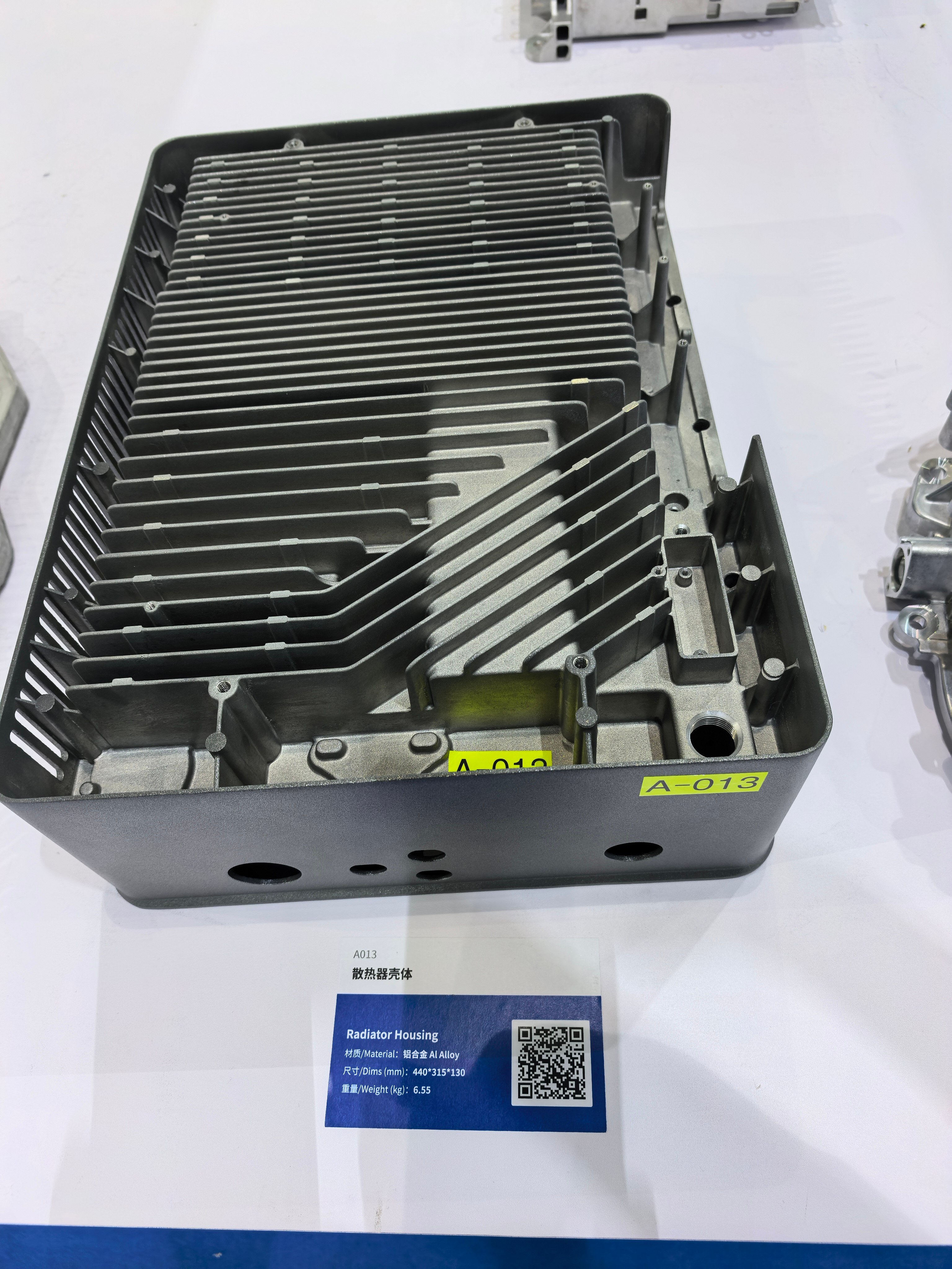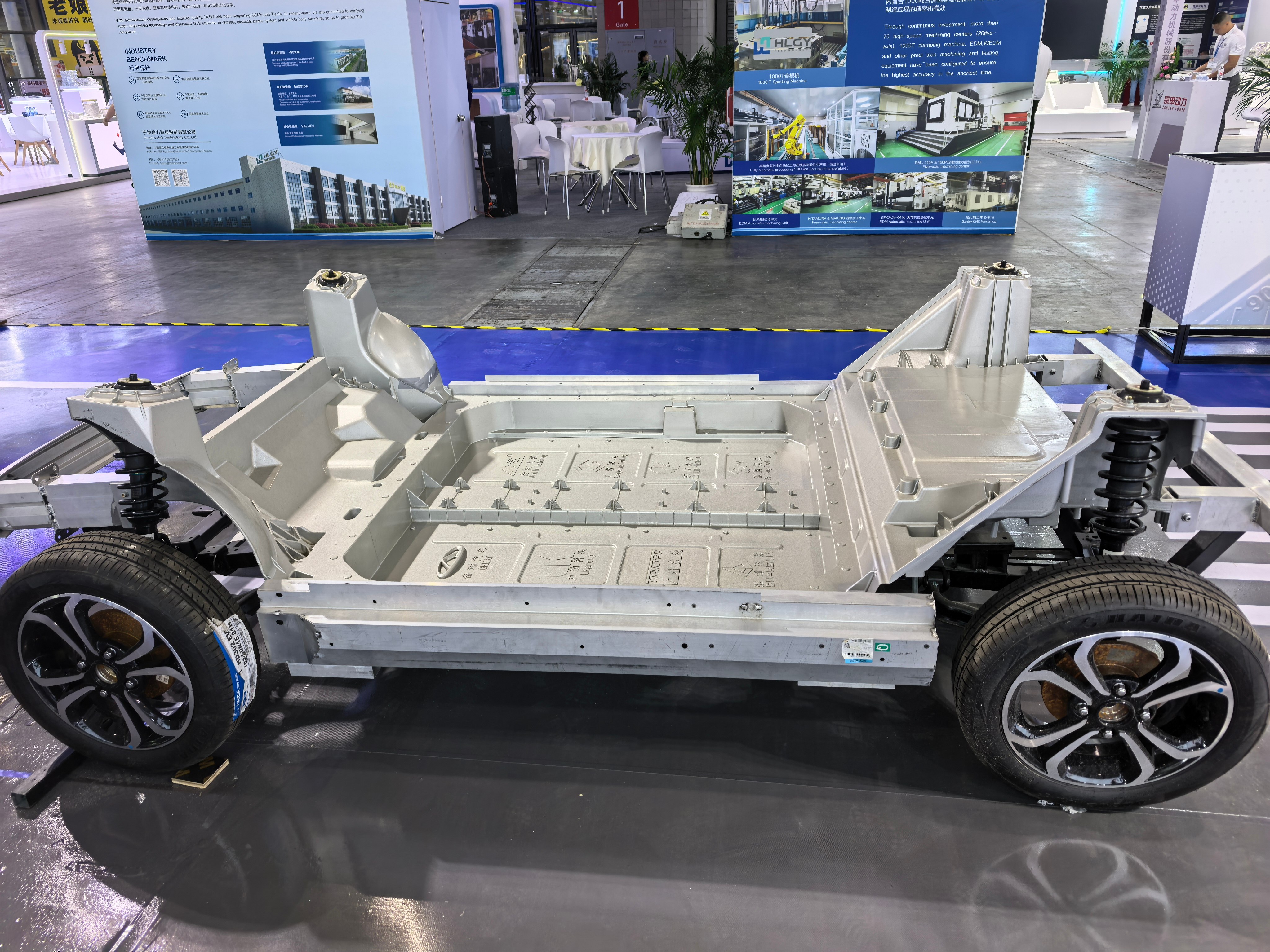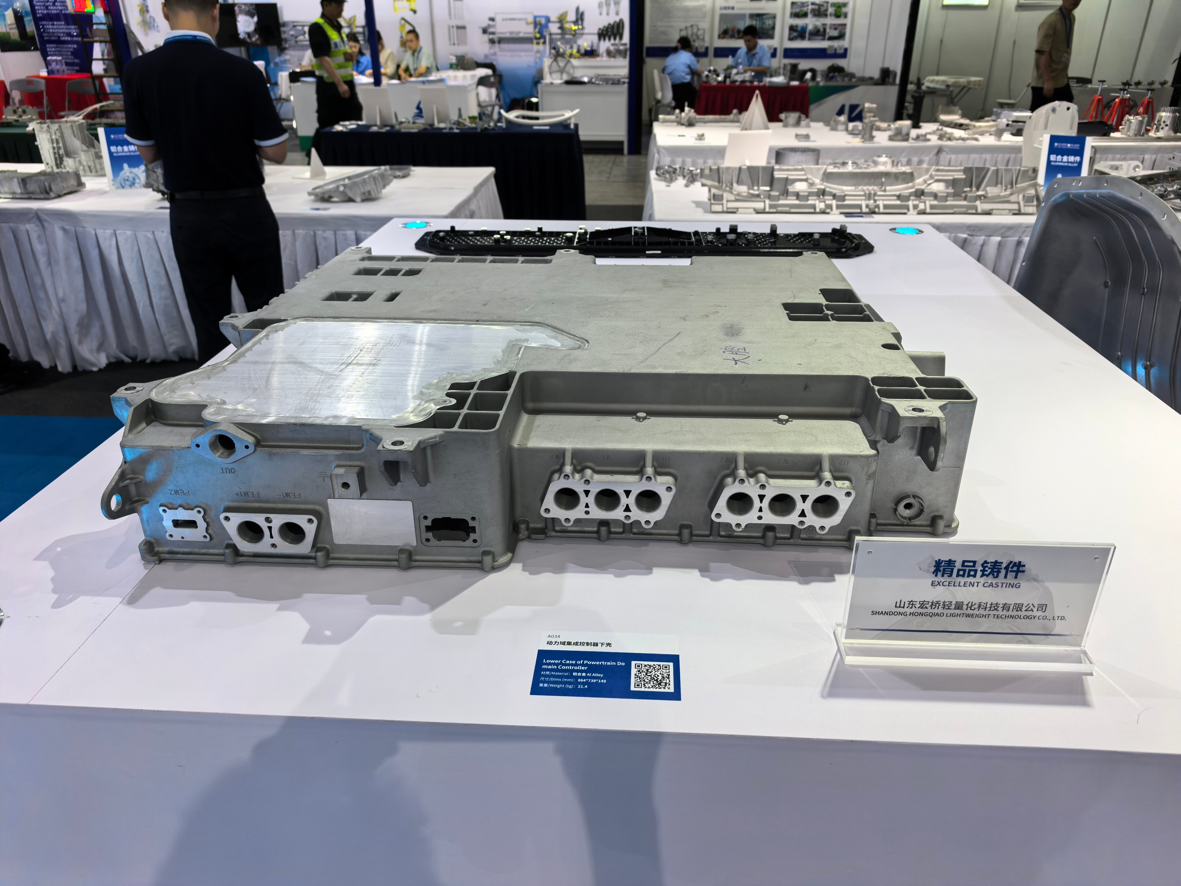 现场展示了包括大型一体压铸件、电池托盘、结构副车架、CNC加工成品等关键部件。